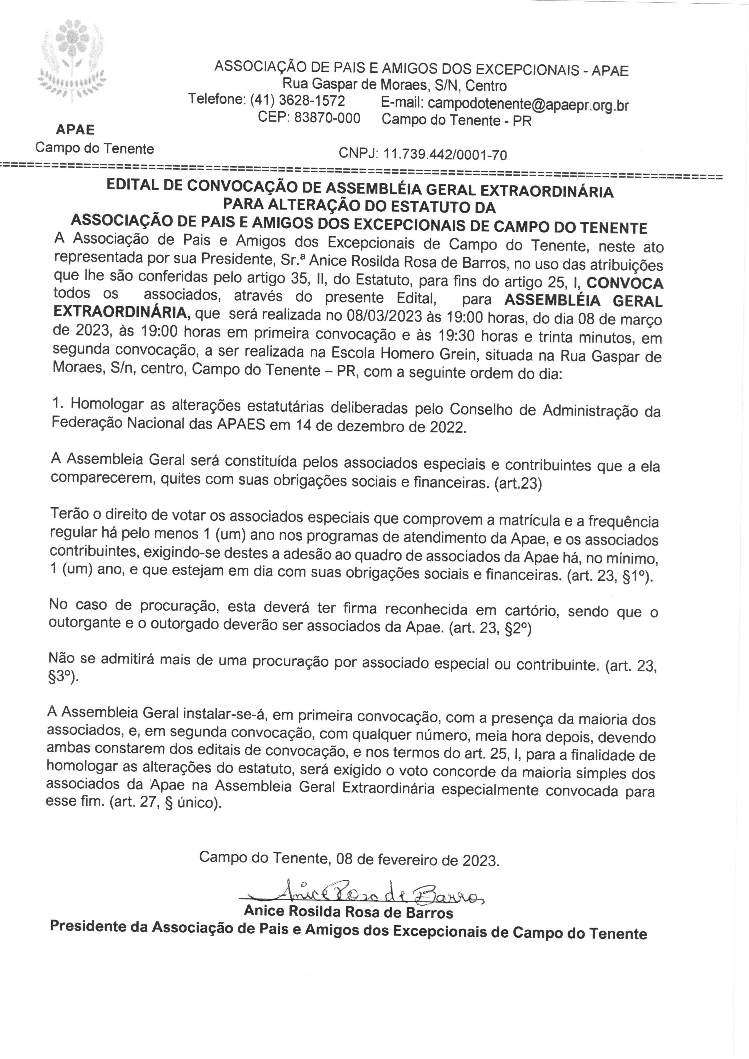Edital de Convocação de Assembleia Geral Extraordinária para alteração do estatuto da associação de pais e amigos dos excepcionais de Campo do Tenente.