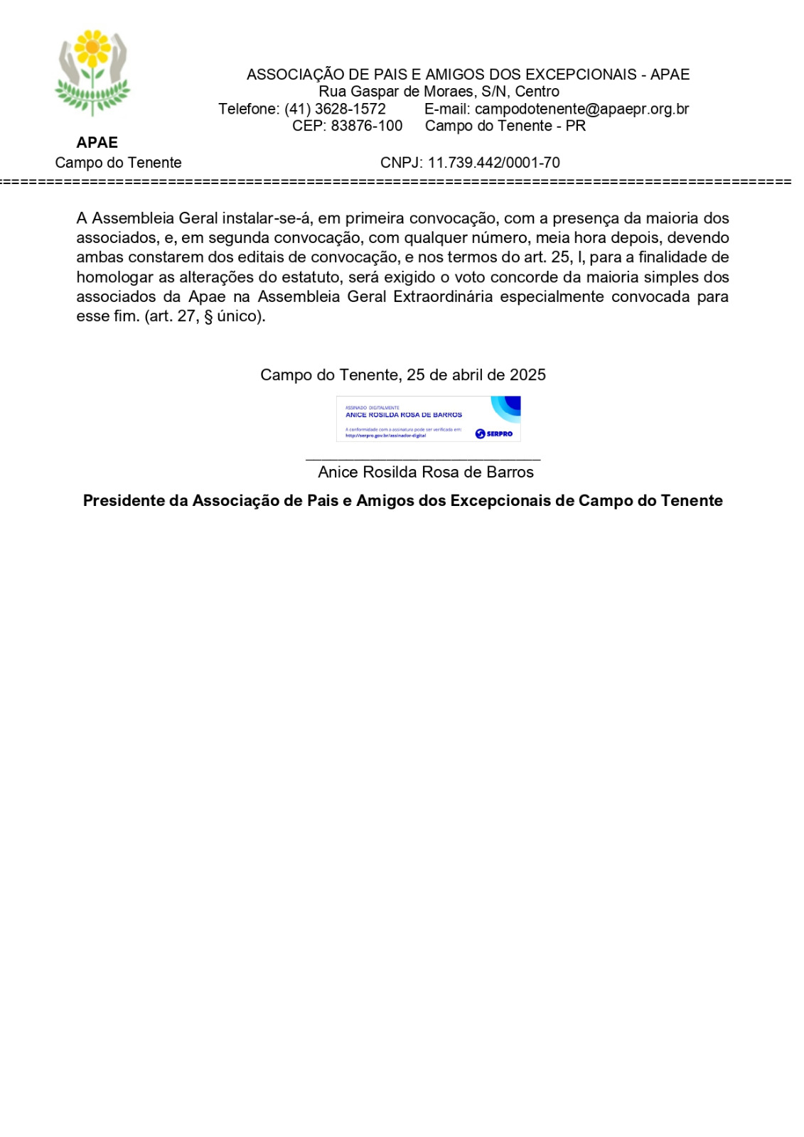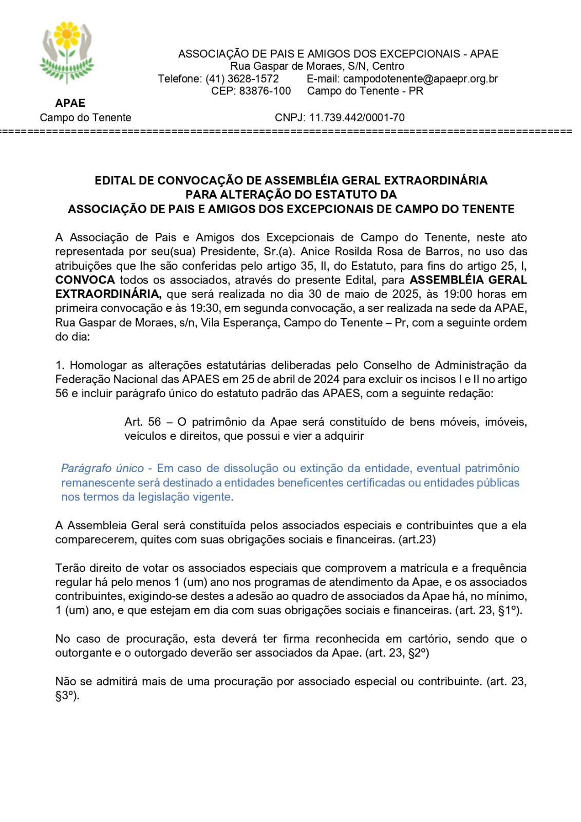 A Associação de Pais e Amigos dos Excepcionais de Campo do Tenente, neste ato representada por seu(sua) Presidente, Sr.(a). Anice Rosilda Rosa de Barros, no uso das atribuições que lhe são conferidas pelo artigo 35, II, do Estatuto, para fins do artigo 25, I, CONVOCA todos os associados, através do presente Edital, para ASSEMBLÉIA GERAL EXTRAORDINÁRIA, que será realizada no dia 30 de maio de 2025, às 19:00 horas a ser realizada na sede da APAE, Rua Gaspar de Moraes, s/n, Vila Esperança.